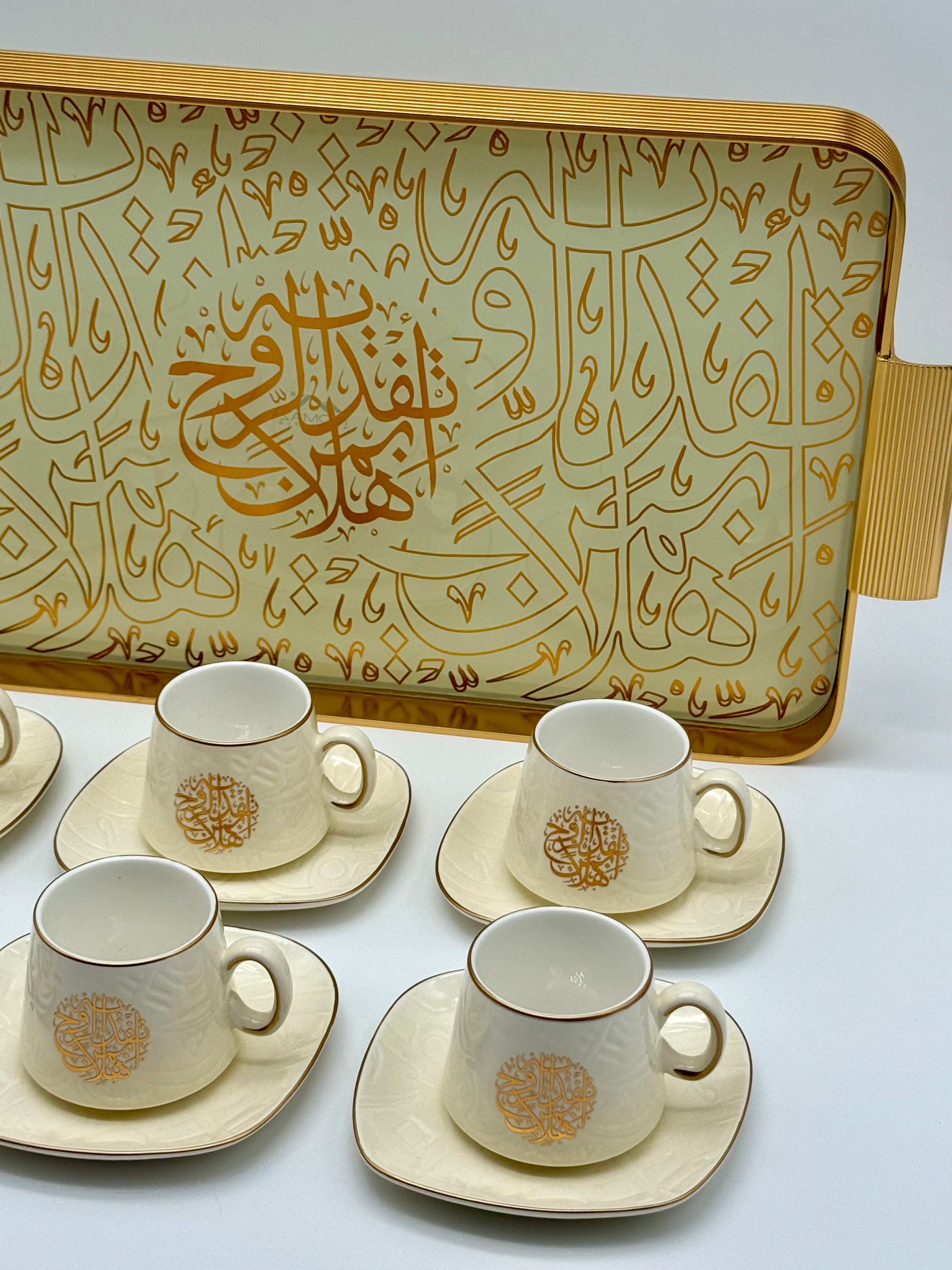 BUNDLE SET - Luxury Off-White Arabic Calligraphy Coffee Cup & Tray Set – 13 Piece Ceramic Espresso Cups with Glass & Metal Serving Tray