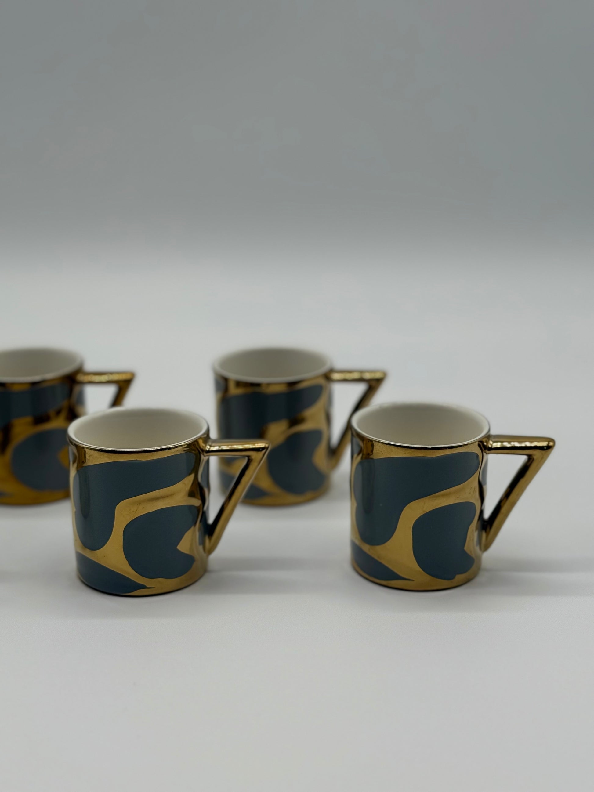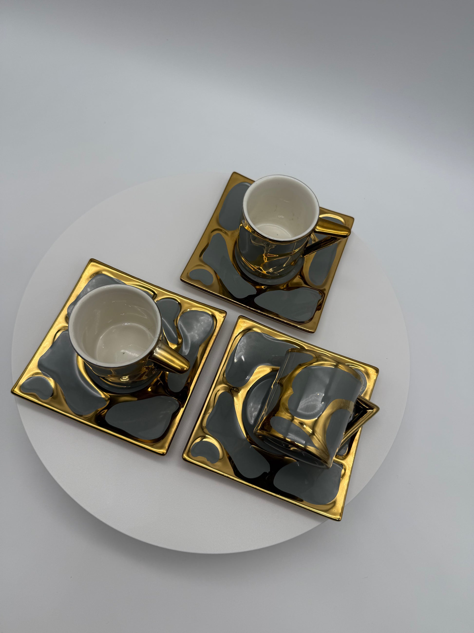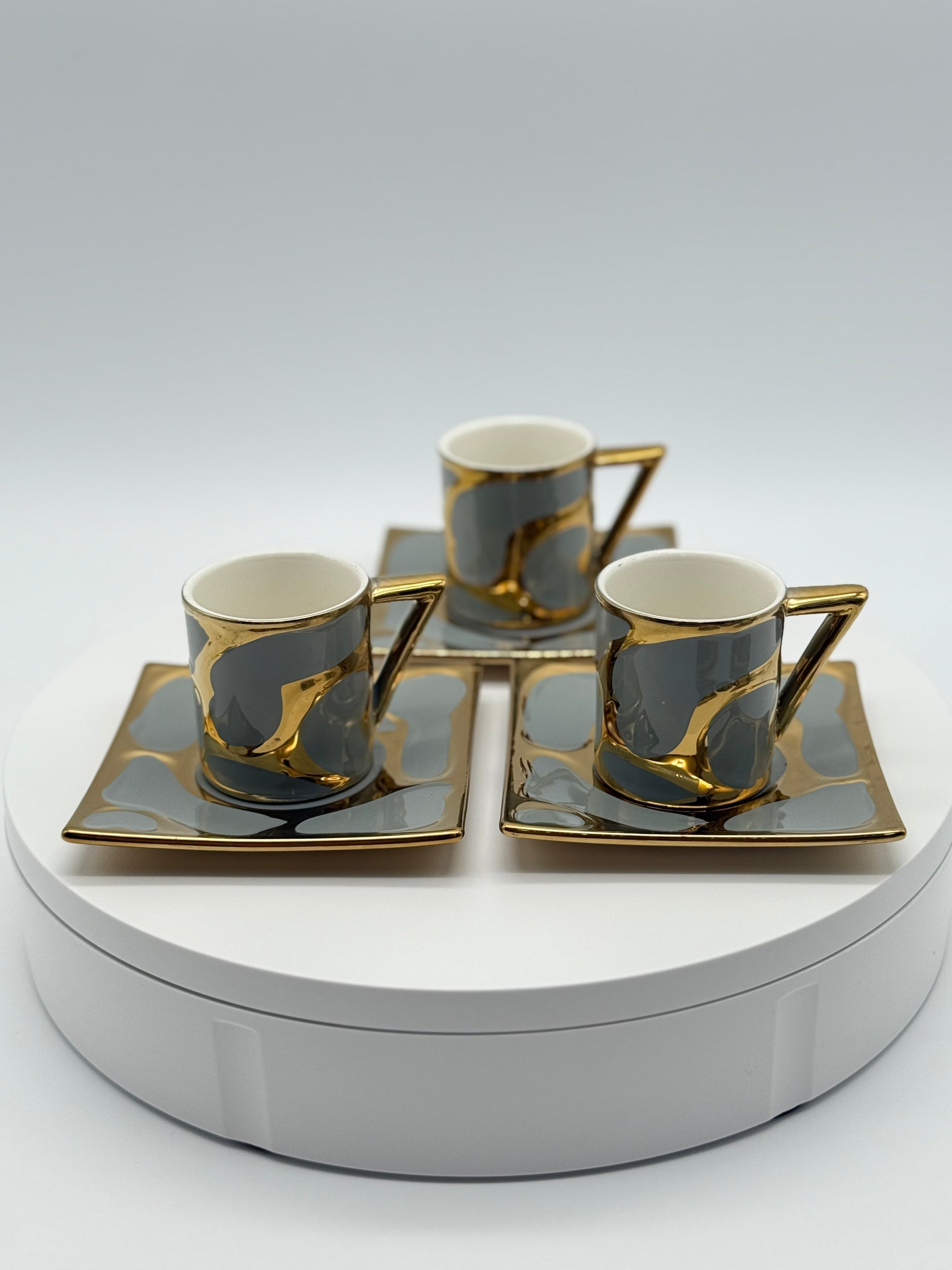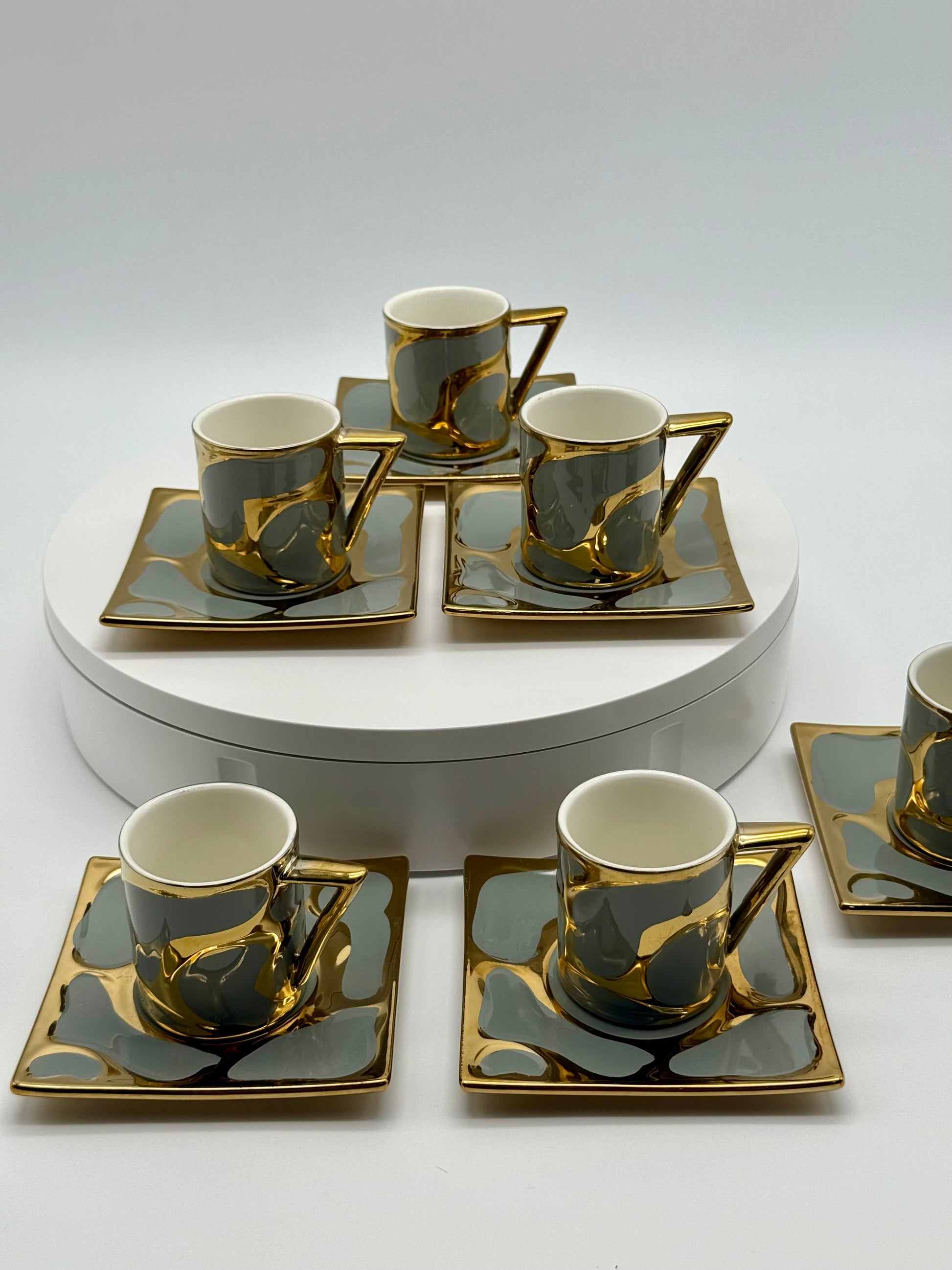 Bring elegance to every sip with this 12-piece luxury coffee cup set, featuring 6 modern espresso cups and 6 matching square saucers. The striking gray and gold porcelain design blends modern sophistication with timeless charm, making it perfect for espresso, Turkish coffee, cappuccino, or after-dinner drinks.