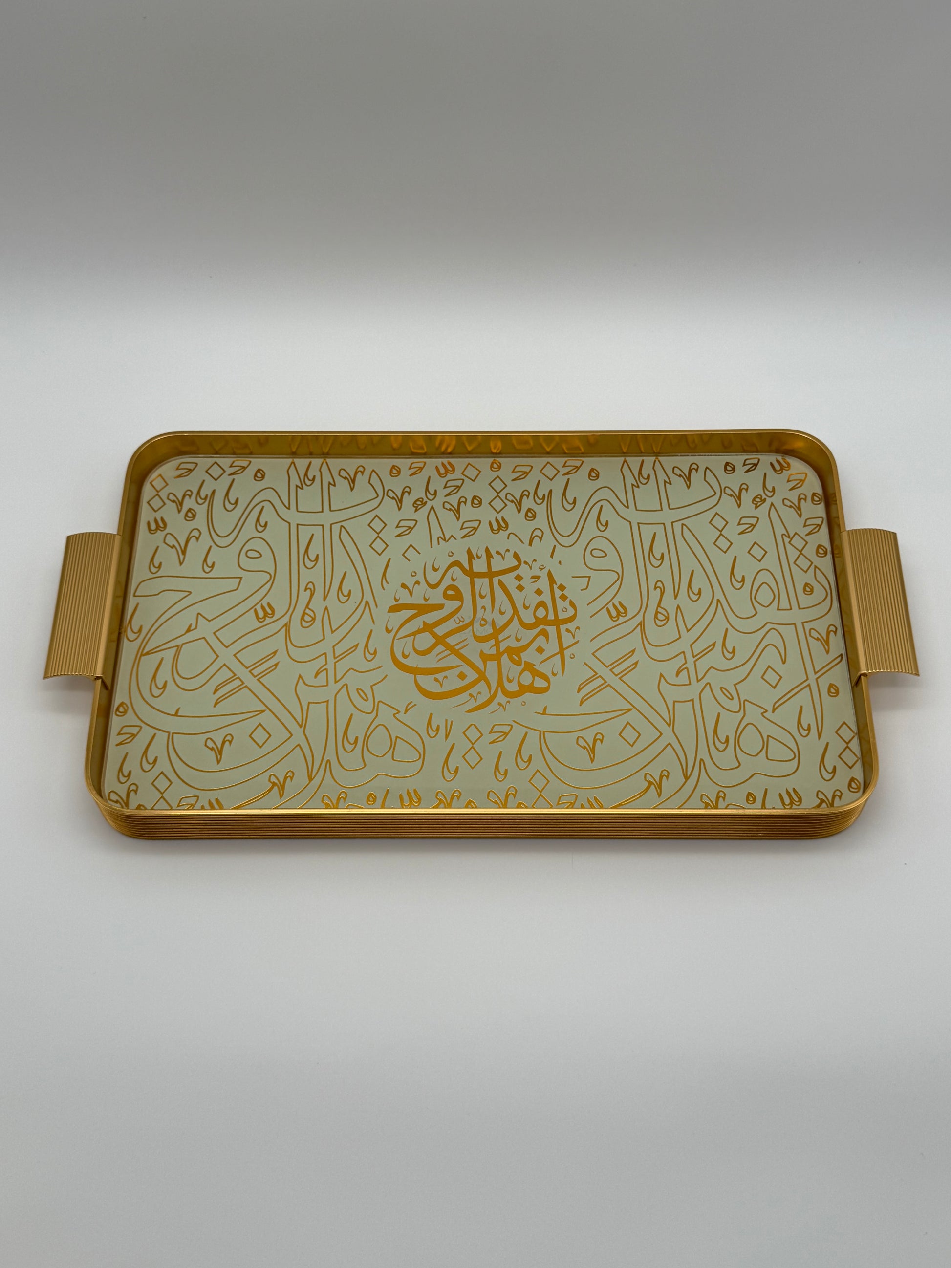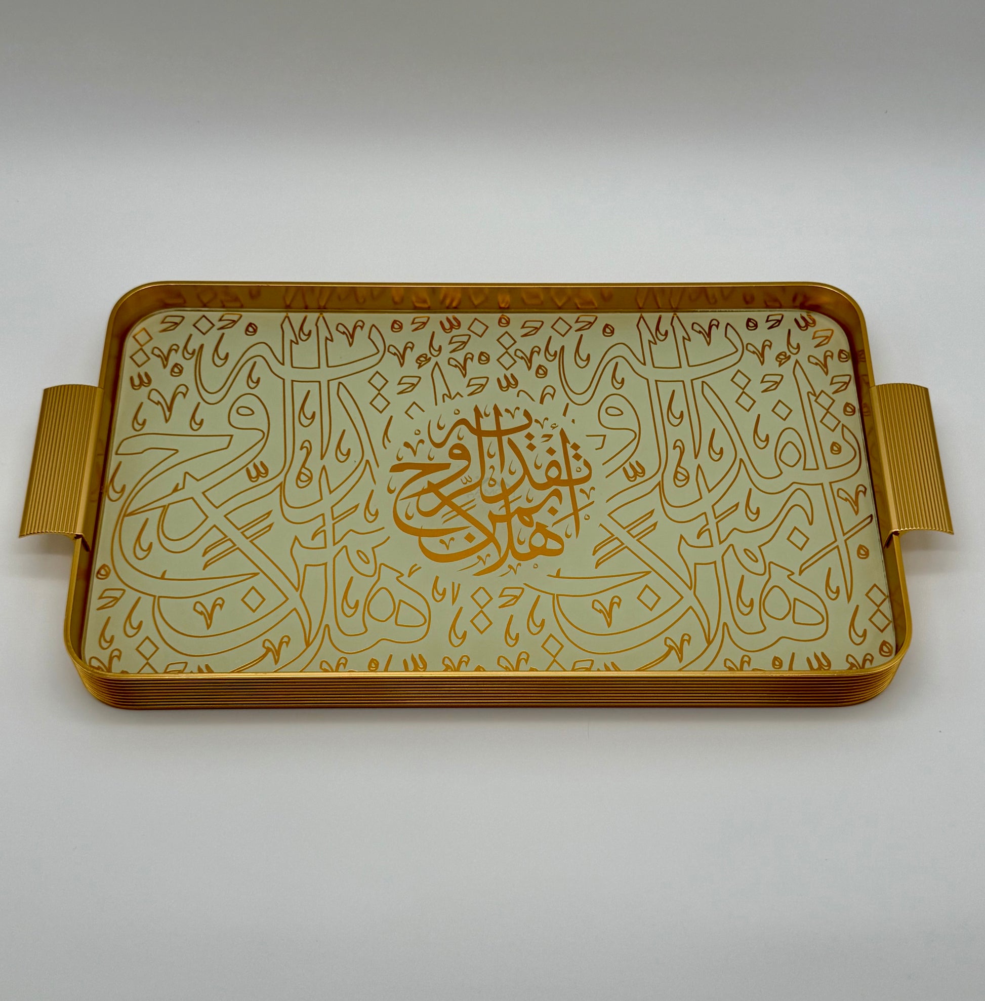 Complete your hosting experience with this 13-piece Arabic calligraphy coffee set, including 6 off-white porcelain espresso cups, 6 saucers, and a matching serving tray. The tray features glass front and back with gold-finished metal sides, complementing the cups beautifully. Each piece is inscribed with the phrase أهلاً بمن تفدى به الروح (Welcome to the one dearest to the soul) in shimmering gold calligraphy. A perfect choice for espresso, Turkish coffee, Ramadan hosting, Eid gifting, weddings, or elegant Islamic décor.