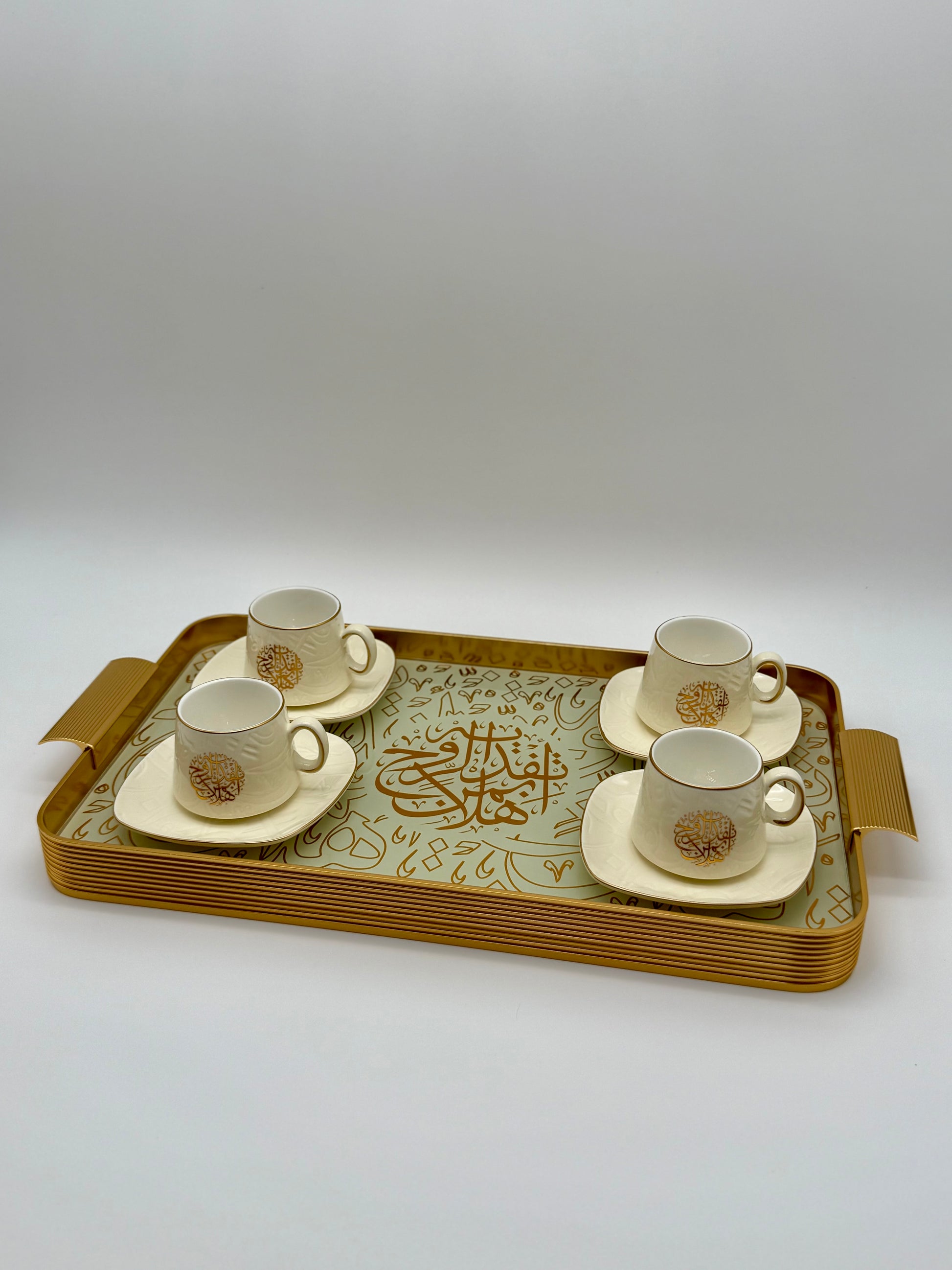 BUNDLE SET - Luxury Off-White Arabic Calligraphy Coffee Cup & Tray Set – 13 Piece Porcelain Espresso Cups with Glass & Metal Serving Tray