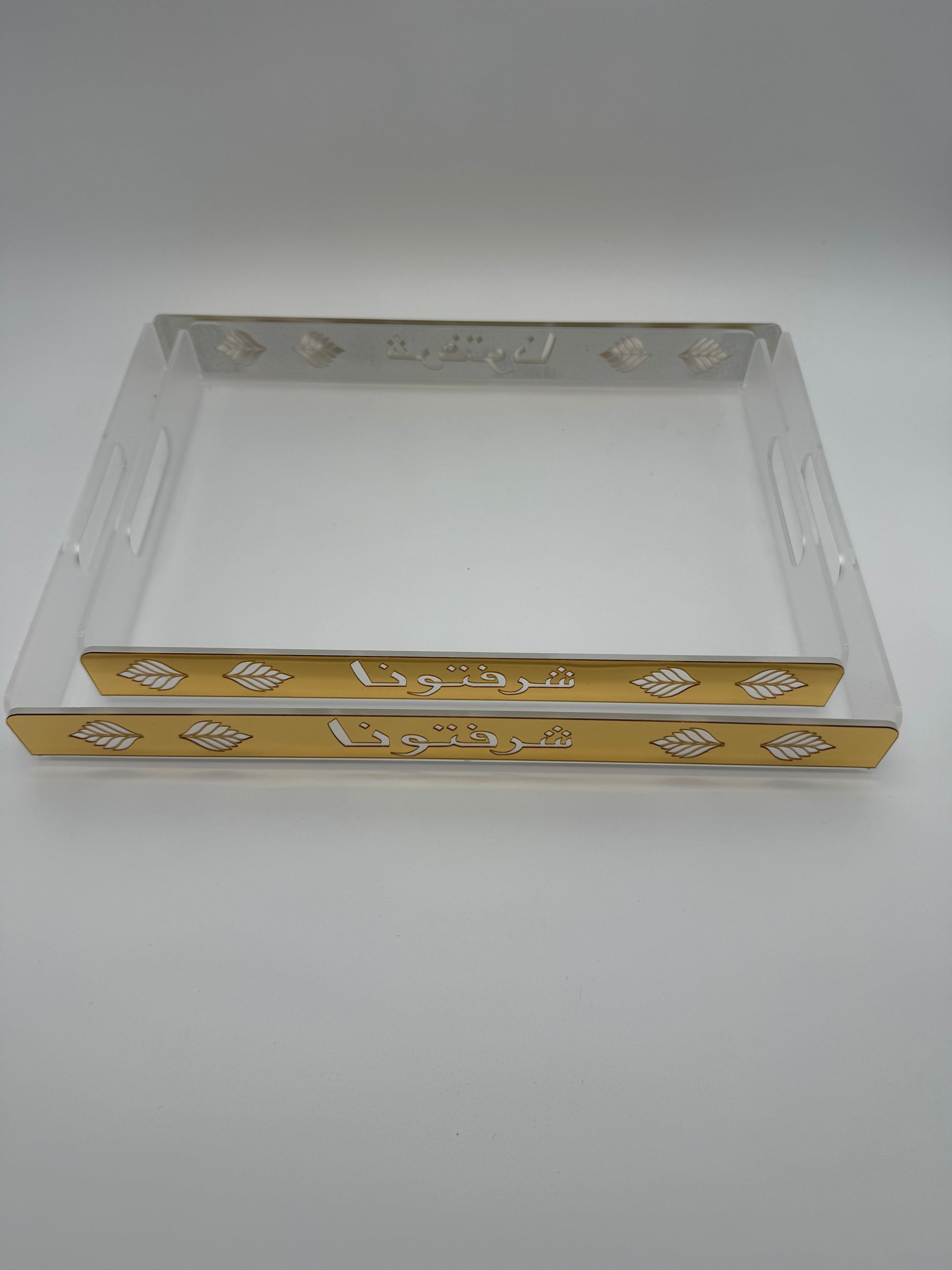 Welcome your guests in style with this set of 2 Arabic calligraphy serving trays, designed with the phrase “شرفتونا” (Sharaftuna – You have honored us). Crafted from durable acrylic with gold and silver finishes, these trays are both modern and meaningful, perfect for serving coffee, tea, desserts, or sweets.